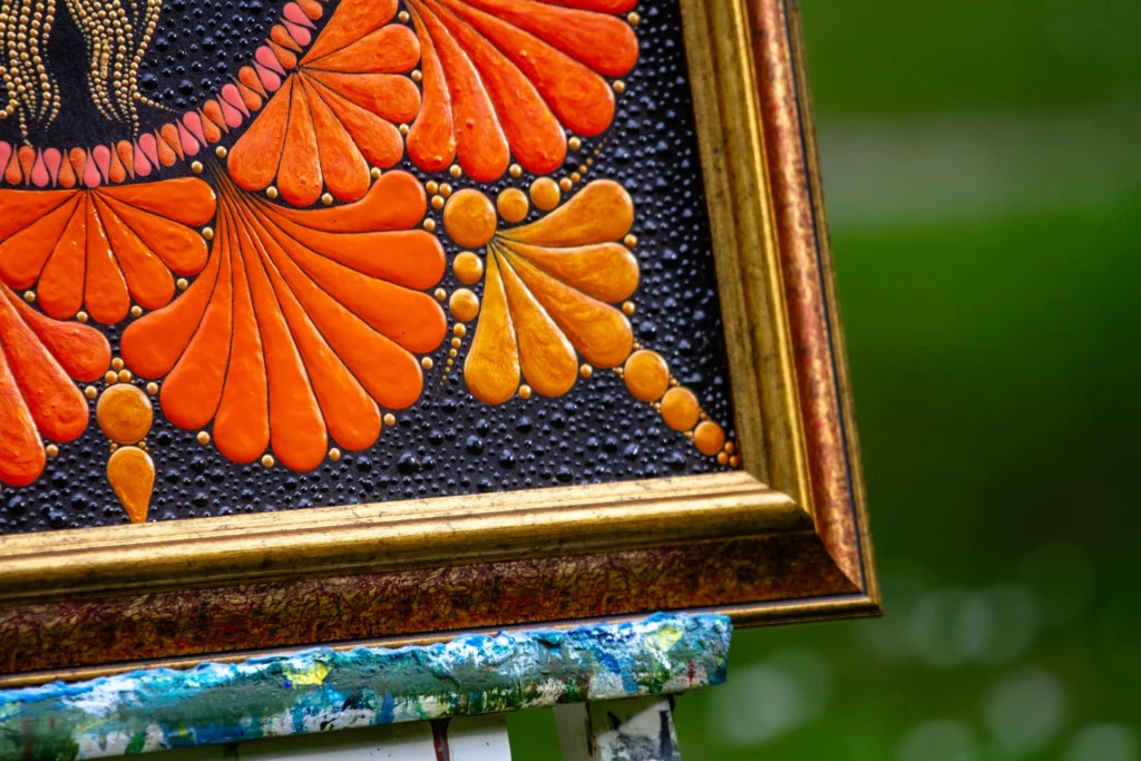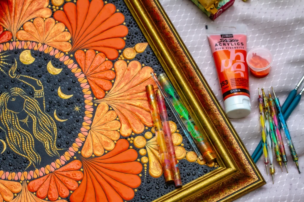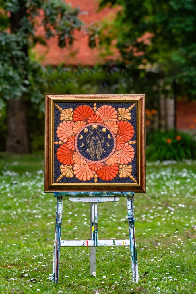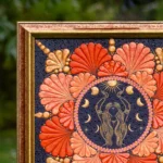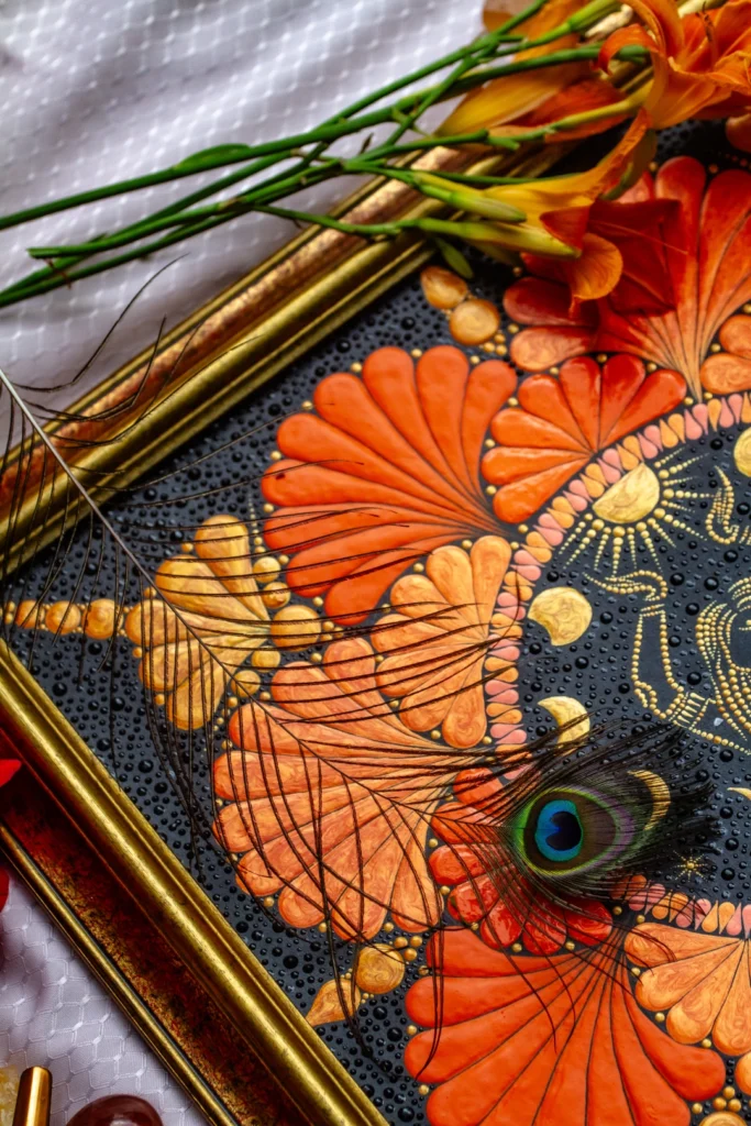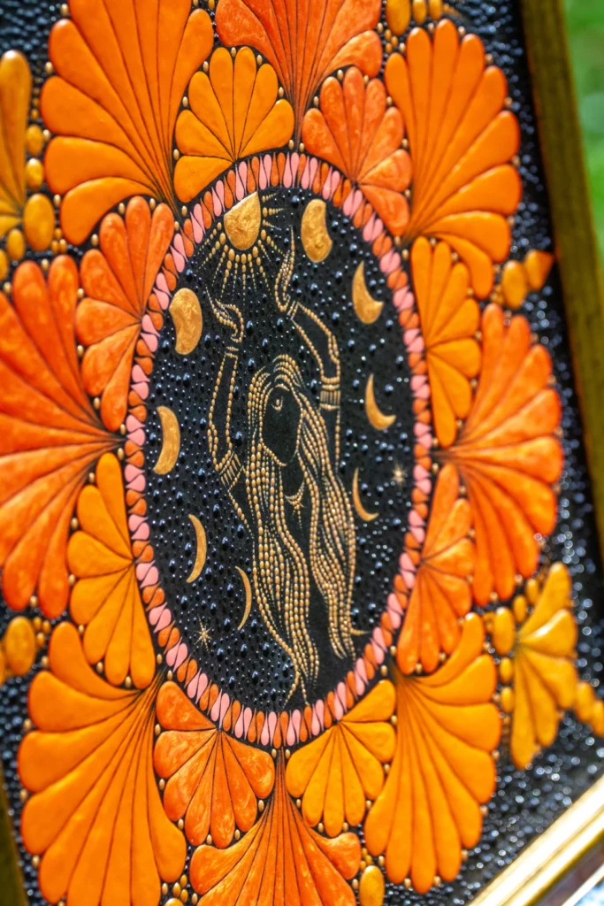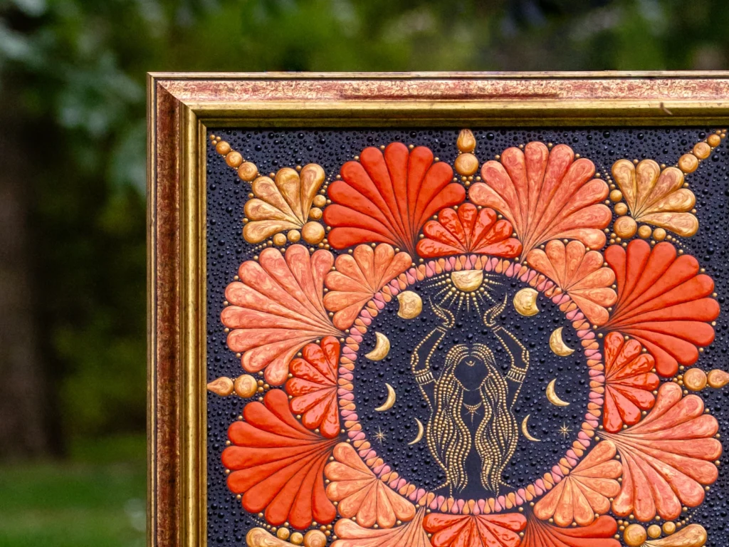 Paveikslas „Deivė“ – tai daugiau nei dekoracija. Tai šiltų spalvų, subtilių formų ir išraiškingų detalių susiliejimas, kuris kasdien pripildo erdvę ramybės, jaukumo ir kūrybinės energijos. Švelnūs oranžiniai tonai, žaižaruojantys aukso akcentai ir lengvi ritmiški taškai kviečia stabtelėti, atsikvėpti ir pasisemti naujų jėgų.